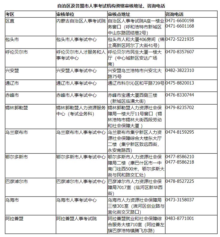 附件:自治区及各盟市人事考试机构资格审核地址、咨询电话
